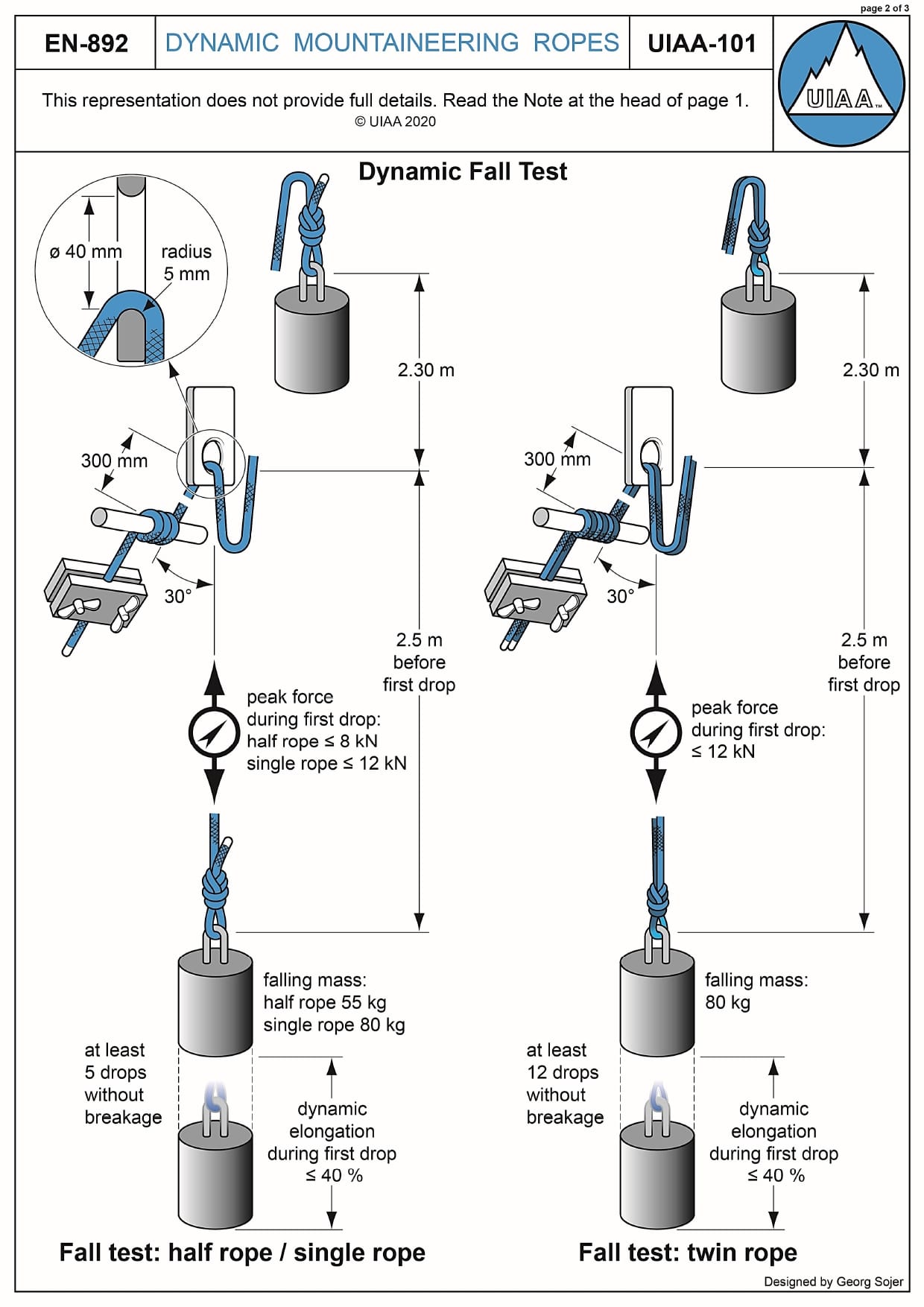 UIAA testează corzile pentru a determina câte căderi pot rezista înainte de a ceda. Aceste teste de laborator aplică o forță mult mai mare decât majoritatea căderilor din lumea reală. Astfel, ratingul de cădere este mai mult o valoare comparativă.